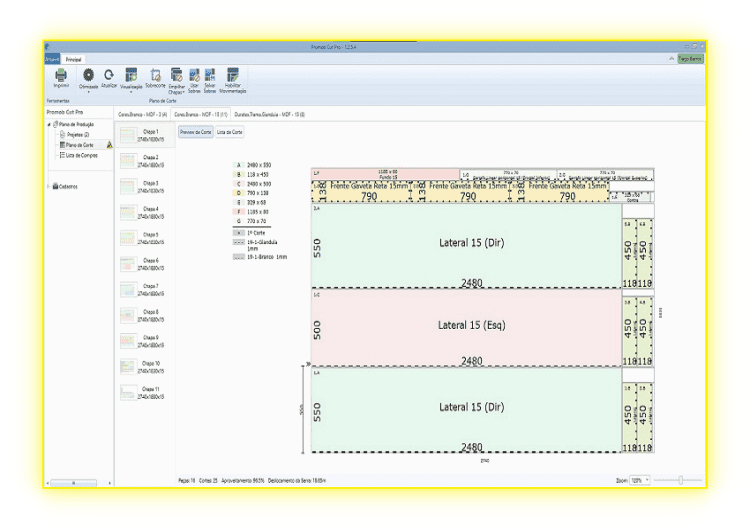 Gere plano de corte automático preciso e executável com as aplicações de fitas de borda corretas e com a listagem de ferragens do projeto incluídas, gere lista de peças, plano de produção, etiquetas, tudo isso com alguns cliques, chega de perder horas com cálculos. USE O PLANO DE CORTE NA SUA MARCENARIA OU ENVIE OS DADOS PARA COMPRAR MATERIAL CORTADO NAS MADEIREIRAS.